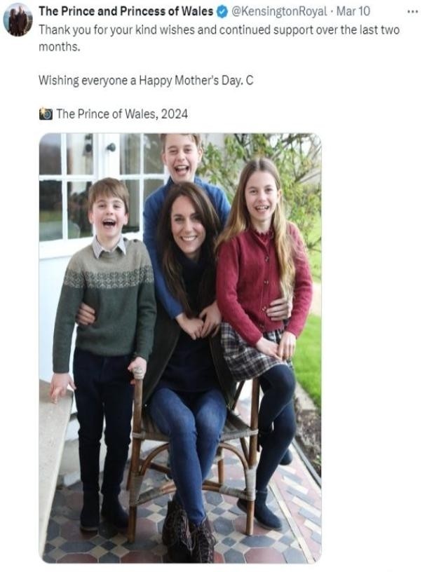 为平息流言,肯辛顿宫于3月10日对外公布了一张她与三名子女的家庭合影,并声称由威廉王子亲自掌镜,意在展示其恢复良好、家庭和睦。